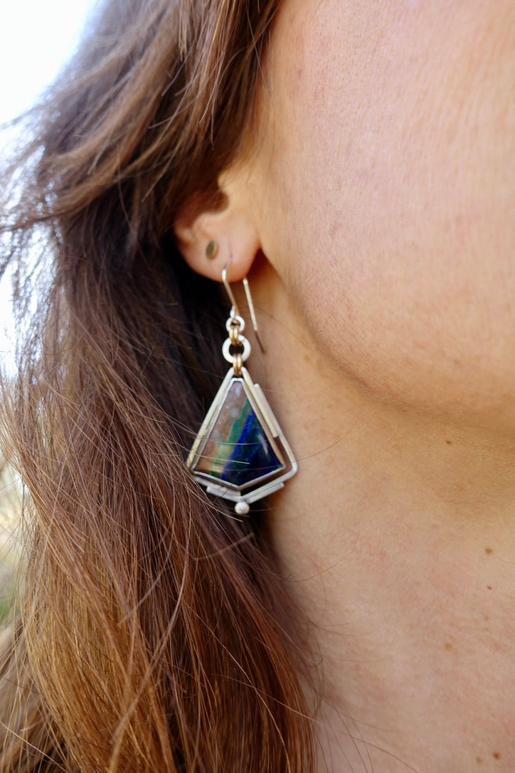 These sterling silver earrings feature striking Azurite gemstones in a modern geometric design. A white sapphire accent adds a touch of sparkle, complementing the rich blue and earthy tones.