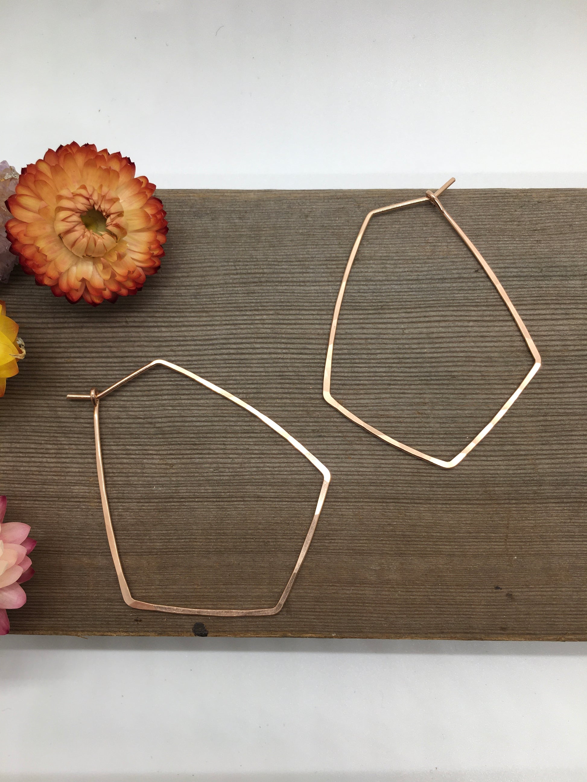 These striking hammered hoops feature a unique crystal-inspired shape, combining edgy geometry with artisanal elegance. Lightweight yet bold, they're the perfect hoop for making a modern statement.