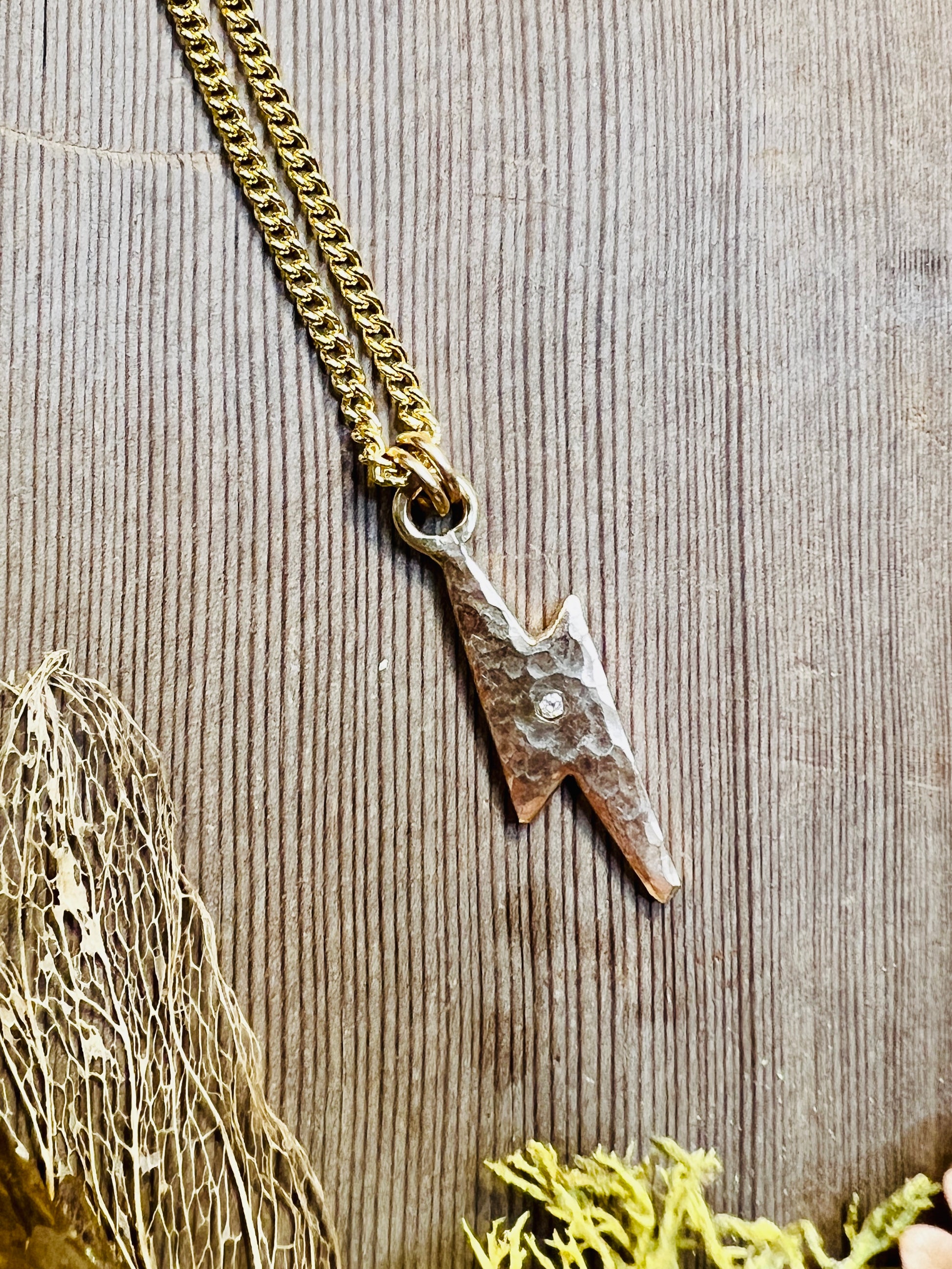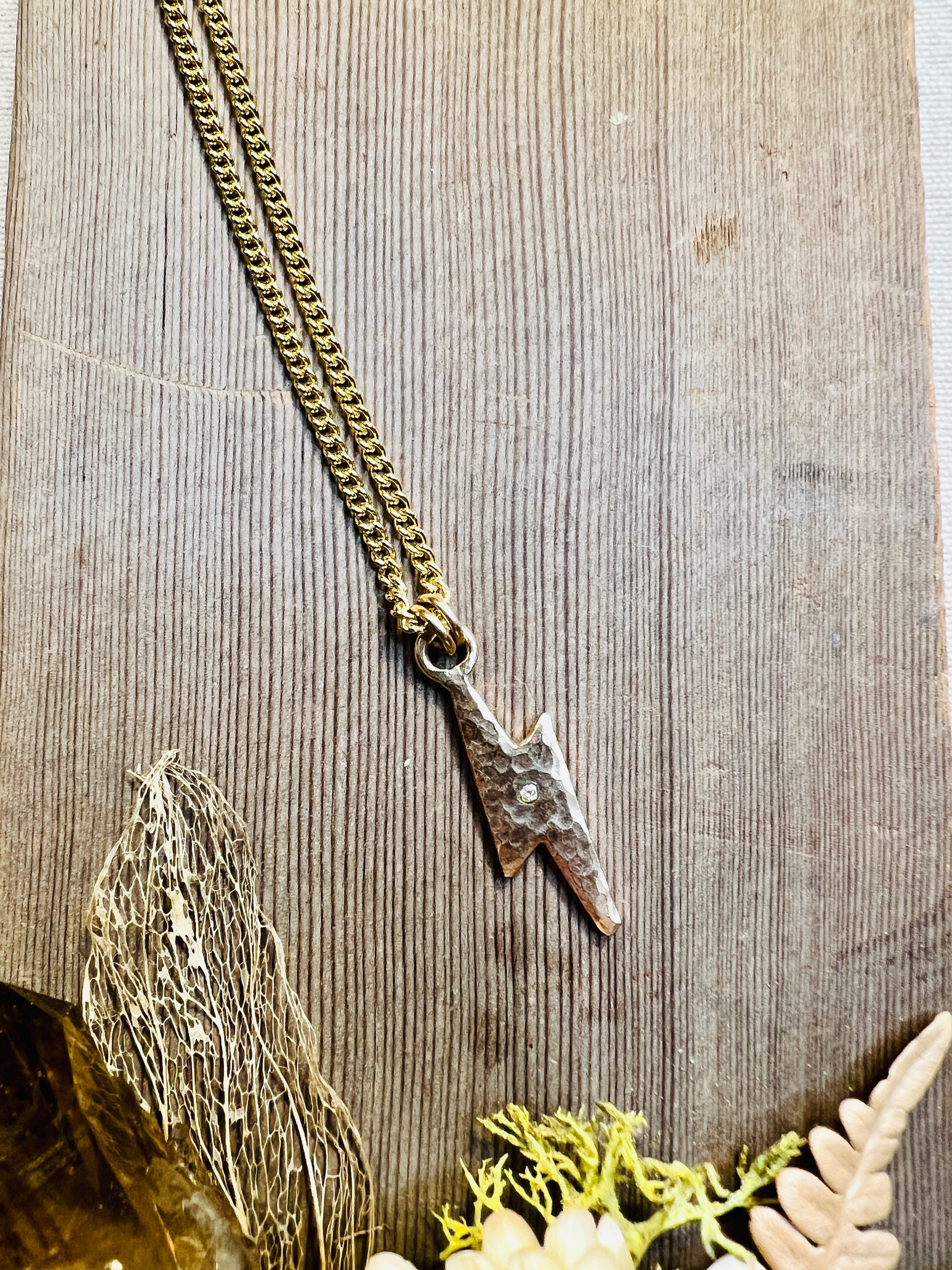 Crafted from 14k gold-filled material, it combines the luxurious allure of solid gold with enhanced durability and affordability. The sleek, lightning-shaped charm is modern and edgy, elevated by a sparkling flush-set diamond that adds a touch of brilliance to its design.
