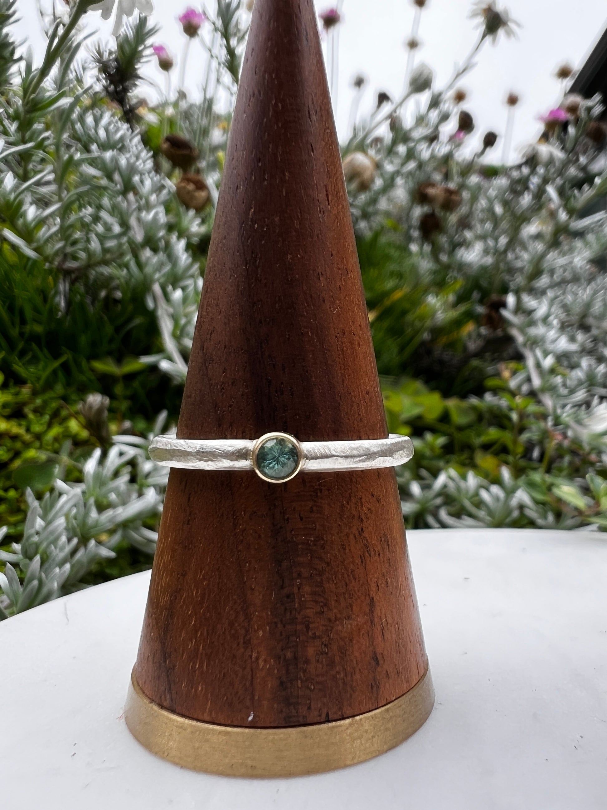 - Band: Sterling silver, hand finished with an organic texture, approx. 2mm wide
