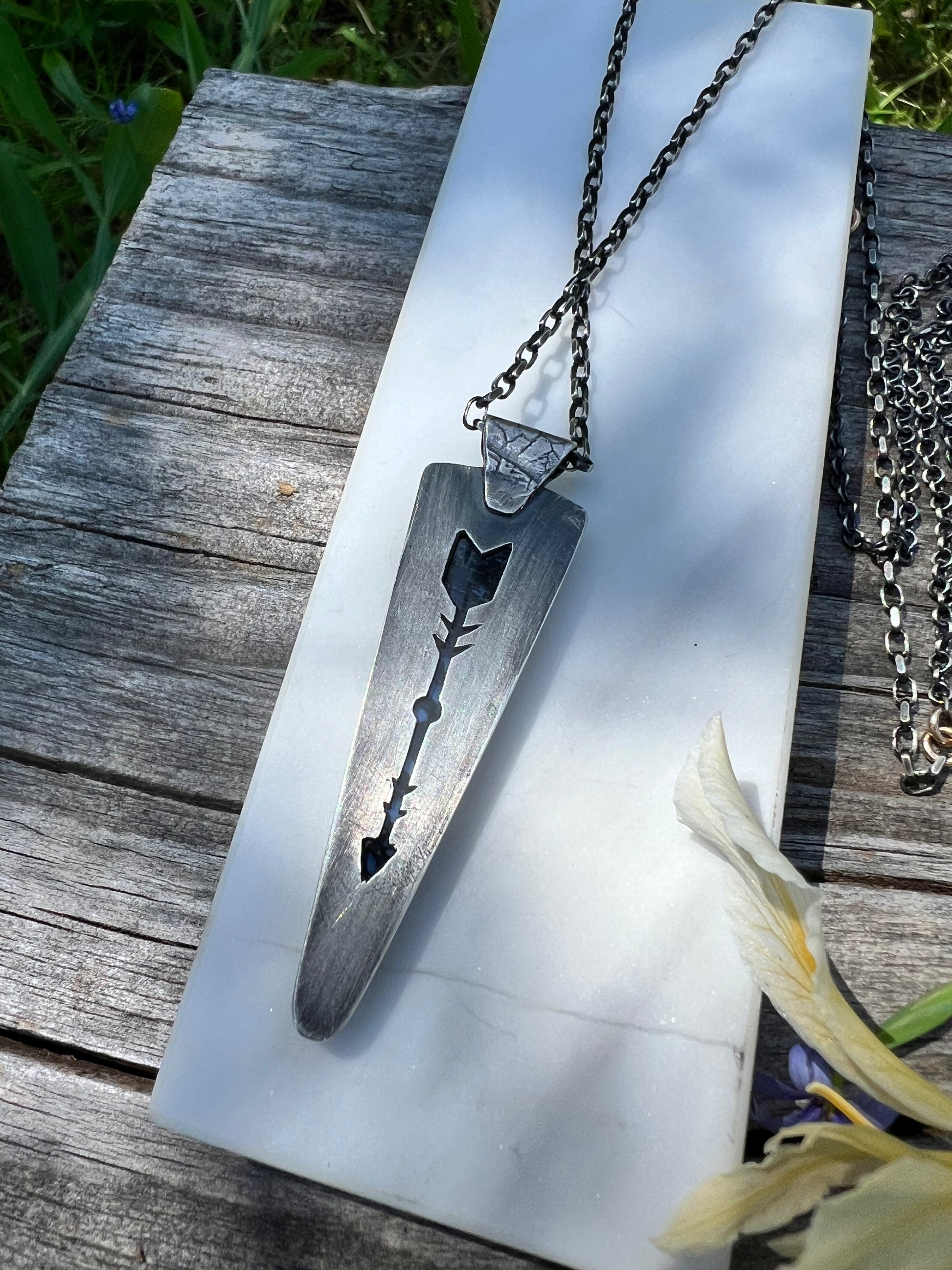 This striking necklace features a centerpiece of deep blue petrified palm set in sterling silver, showcasing intricate natural patterns and timeless beauty. A finely detailed, leaf-textured bail adds organic elegance, while the 30" mixed-style chain, accented with 14k gold fill, completes the design. Combining ancient materials with artisanal craftsmanship, this bold piece celebrates the raw beauty of nature and the spirit of adventure.