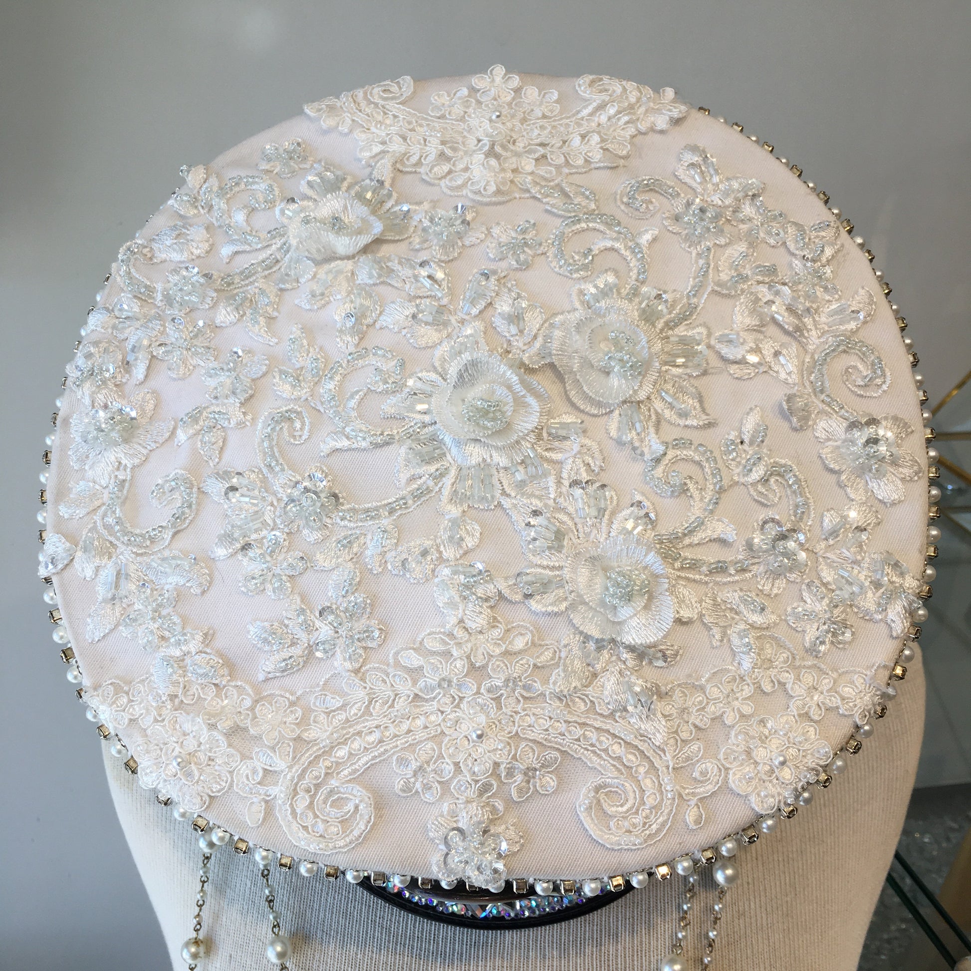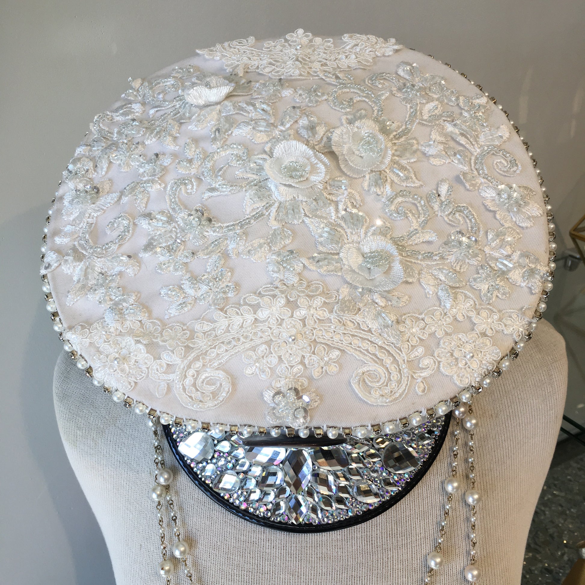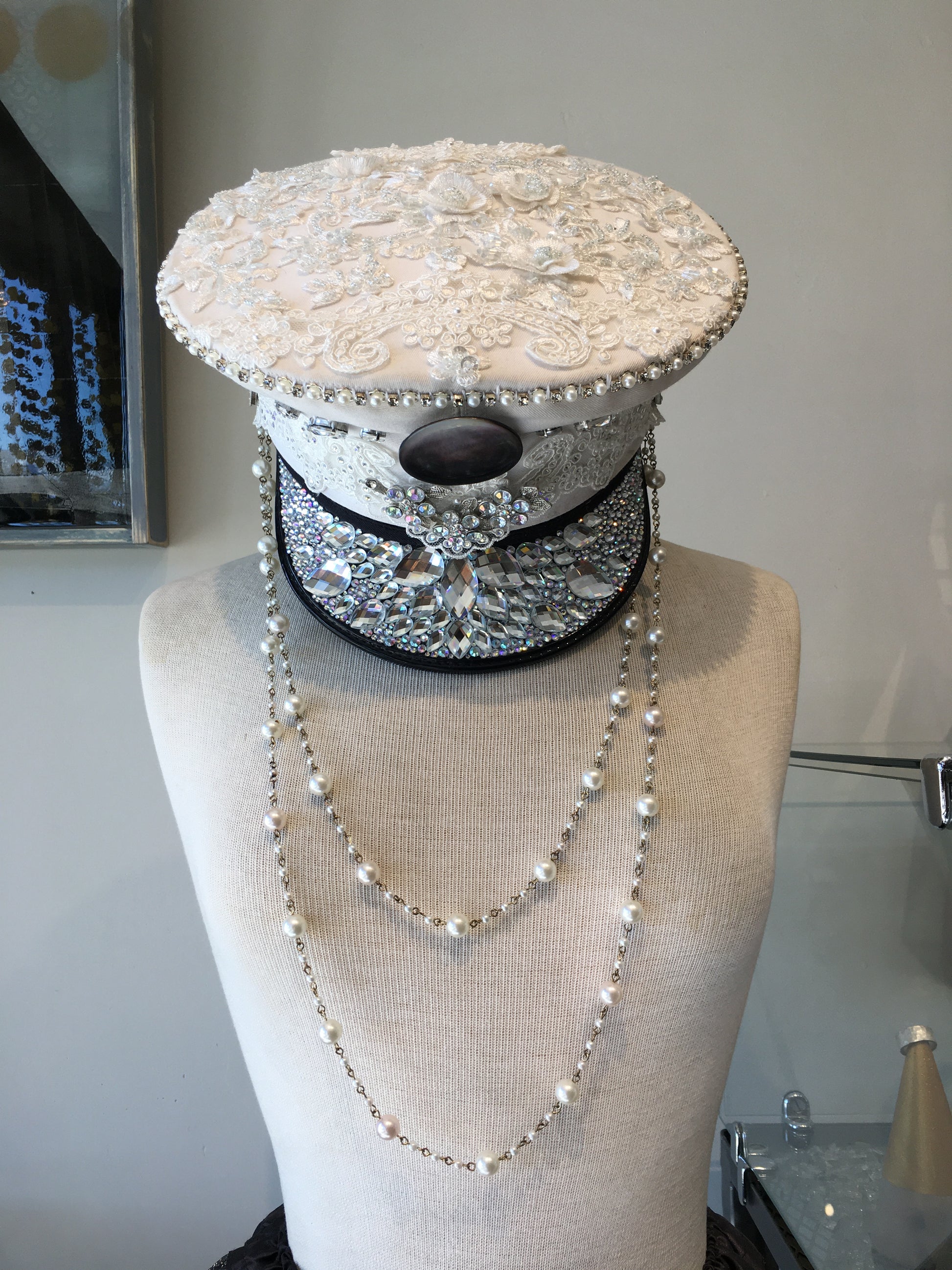 Carefully crafted from an original captain's hat, shimmering glass rhinestones catch the light like glimmering sunlight on open water, while a bold, vintage mother-of-pearl button evokes the elegance of bygone eras. Delicate bridal lace appliqué cascades the crown of the hat, adding a romantic touch of ocean foam cresting on the waves.