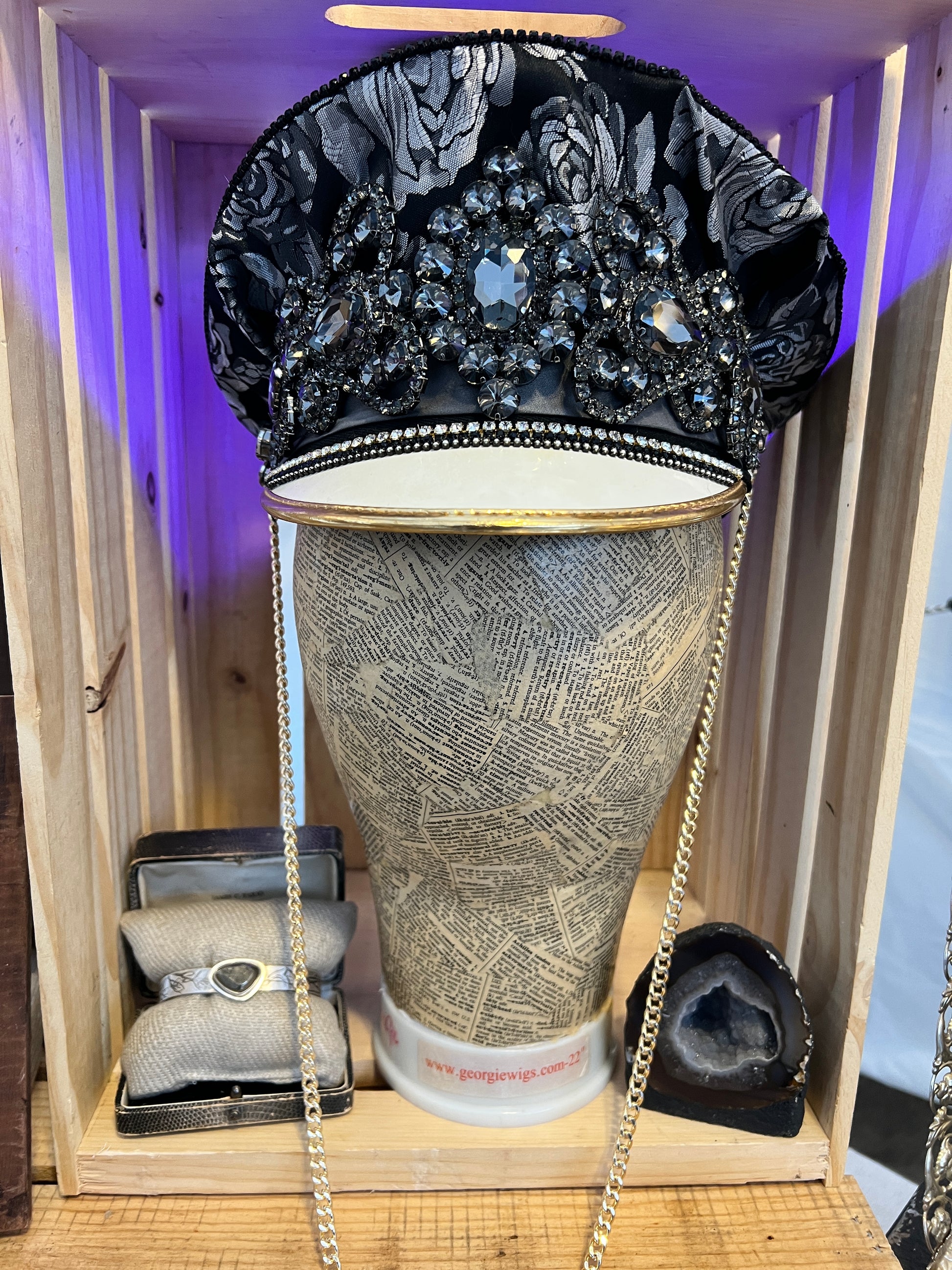 Covered in luxurious black and silver rose-patterned fabric, the hat exudes an air of dark romance. Glass rhinestone trim adds a dazzling edge, accentuating the light from its built-in illumination, which creates and ethereal glow. A bold gold chain drapes gracefully across the design, adding a touch of opulence, while silvery-grey oversized glass rhinestones command attention with their dramatic sparkle. Perfect for a night of enchantment or bold self-expression, this hat is a radiant fusion of tradition and contemporary artistry.